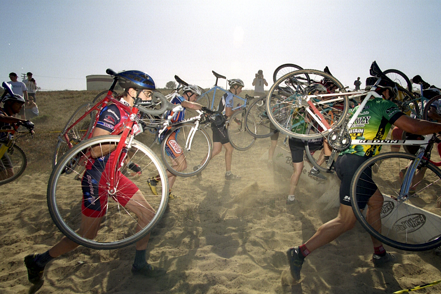 Justin Morgan (l.) shouldering his bike through the sandfest.  Fort Ord  1999